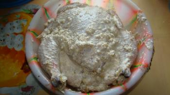 Для начала, если курица замороженная, нужно её разморозить и вымочить. Затем нужно смешать майонез, чеснок и специи. Замочить в нём курицу и оставить на ночь.