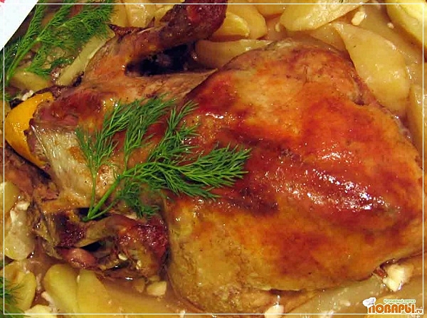 Положить четвертинки апельсина и четвертинки одного яблока внутрь тушки вместе с несколькими веточками укропа и небольшим кусочком очищенного имбиря.