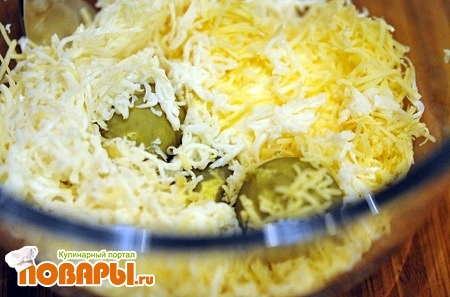 Яйца отварить. Белок отделить от желтка. Белок растереть на мелкой терке. Сыр растереть на мелкой терке.