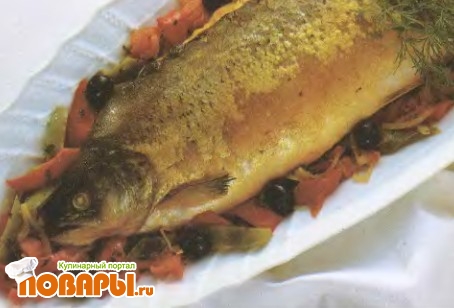 Запекать 30-40 минут, пока лосось не будет готов (надо следить, чтобы не высушить), затем осторожно переложить рыбу на большое подогретое блюдо и вынуть нитку. Ложкой распределить овощи вокруг рыбы, украсив блюдо укропом, разрезать на толстые куски и подать на стол вместе с зеленым салатом.