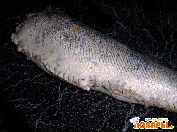 Добавить в фарш яйцо и хлеб. Хорошо перемешать, посолить, добавить специи. Выложить фарш на рыбью шкуру и сшить края. (Во время сшивания хорошо утрамбовывать и по мере необходимости добавлять фарш)