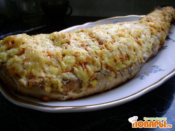 Выложить нашу рыбку на смазанный маслом противень, посыпать сверху морковкой (потереть на крупную терку)и полить немного майонезом.