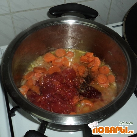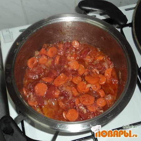 Когда лук станет мягким, добавляем к нему морковь, нарезанную тонкими кружочками. Обжариваем 3 минуты лук и морковь вместе.
