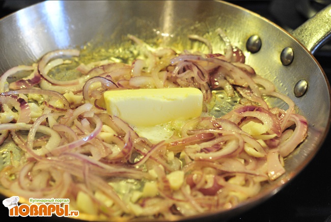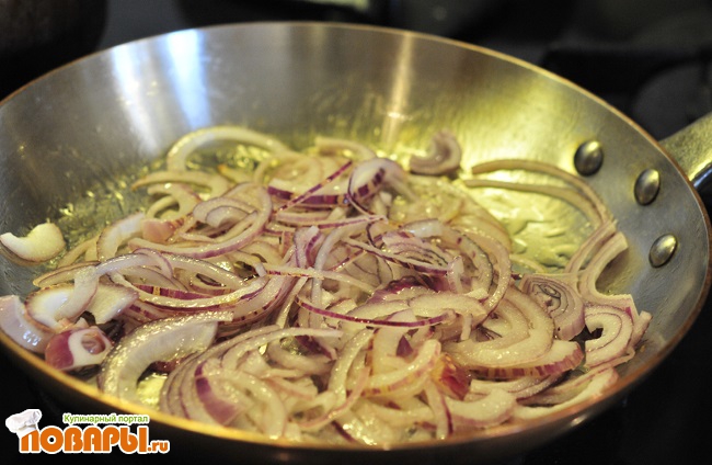 Красный лук порезать полукольцами и добавить в сковородку. Обжаривать до полного размягчения.