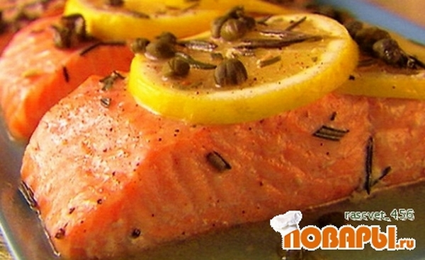 Теперь снова вспоминаем, что у нас в духовке уже готовая рыба, достаем и выкладываем на блюдо, режем на порционные куски и подаем к столу.