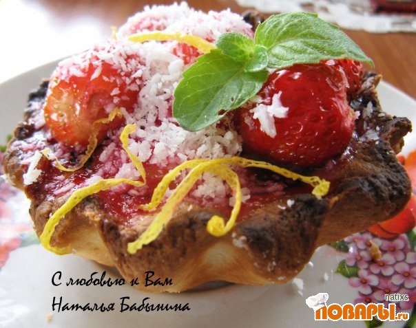 Тесто песочное,внутри корзинки фрукты любые,залитые желе.сверху кокосовая стружка,мята,цедра лимона.