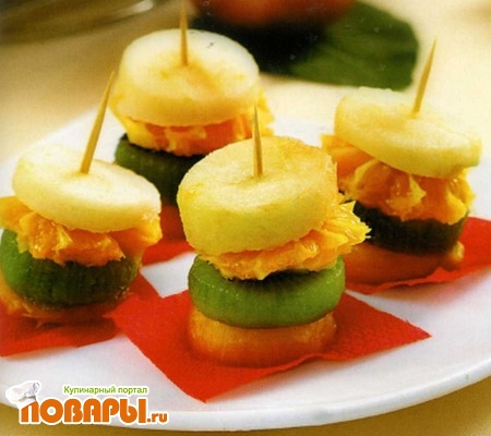Взять зубочистку и насадить на нее приготовленные фруктовые кружочки в следующем порядке: яблоко, апельсин, киви и персик.