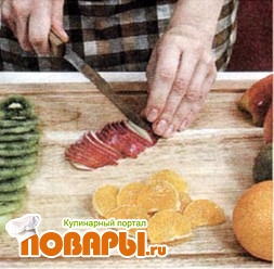 Нарезать тонкими ломтиками киви и яблоки, разделить мандарины на дольки.