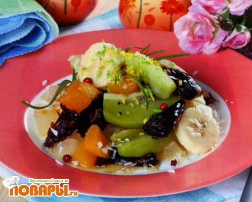 Финики замочить в теплой воде на 30-40 минут, после откинуть на сито, дать стечь воде, нарезать ломтиками. Киви очистить, нарезать дольками. Маракуйю и ананасы нарезать кубиками.