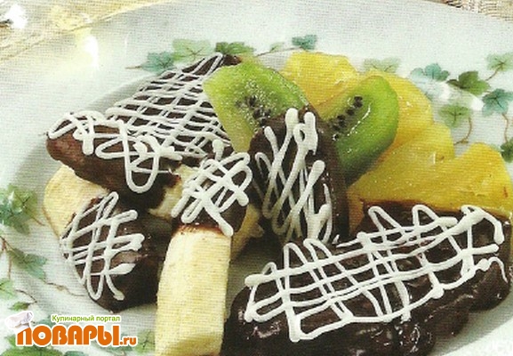 Растопите белый шоколад и нанесите его на фрукты в виде рисунка, снова охладите.