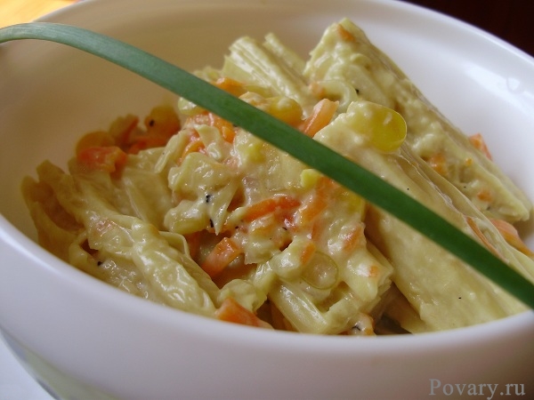 Высыпаем кукурузку, добавляем пару ложек соевого майонеза.