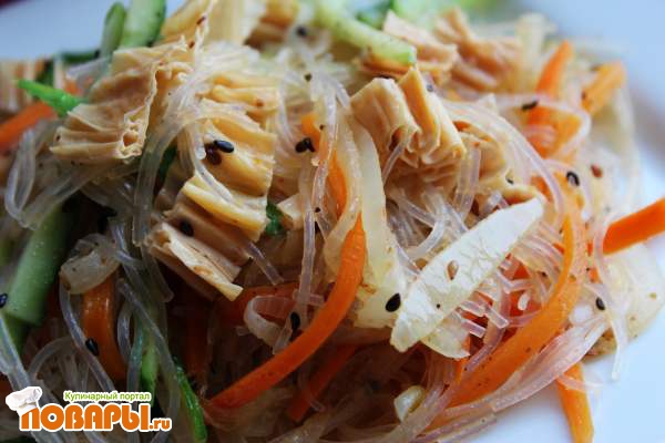 Кипятим воду, опускаем в нее фунчозу и даем ей пару минут покипеть с лапшой. Снимаем с огня, оставляем под крышкой минут на 10-15. Затем сливаем и тщательно промываем, нарезаем.