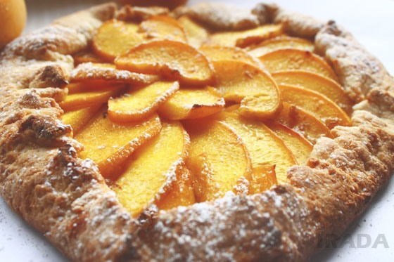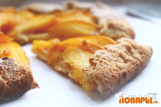 Противень застелить бумагой для выпечки, посыпать немного мукой. Тесто раскатать в круг,уложить на противень. Персики расположить по кругу.(от края отступить на 3-4 см.)