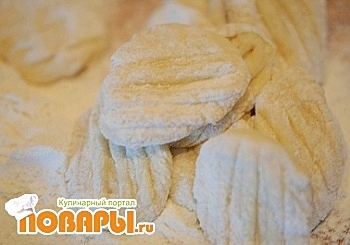 Теперь ложем на муку разрезанной стороной, придавливаем вилочкой, переворачиваем и снова придавливаем вилочкой.