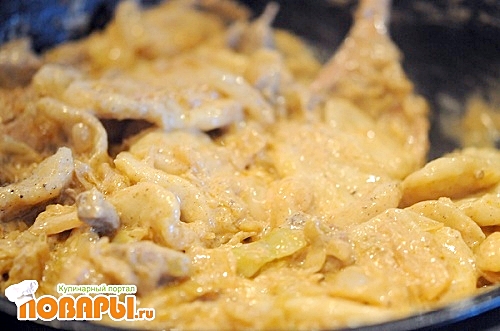 Затем к мясу кладем на обжарку лук.