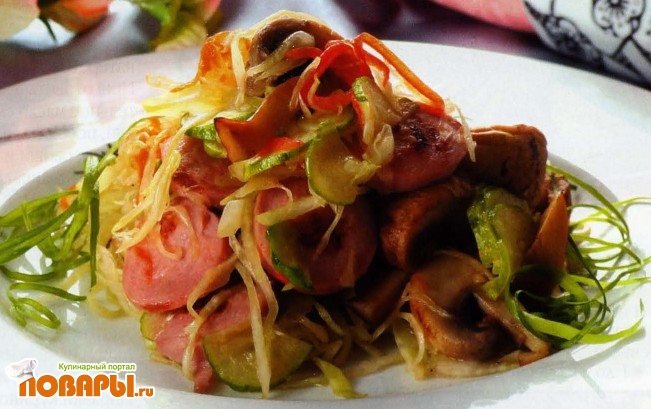 Огурец и болгарский перец нарезать соломкой, смешать с капустой. Добавить к овощам обжаренные грибы и сосиски, перемешать. Заправить салат по вкусу растительным маслом или майонезом.