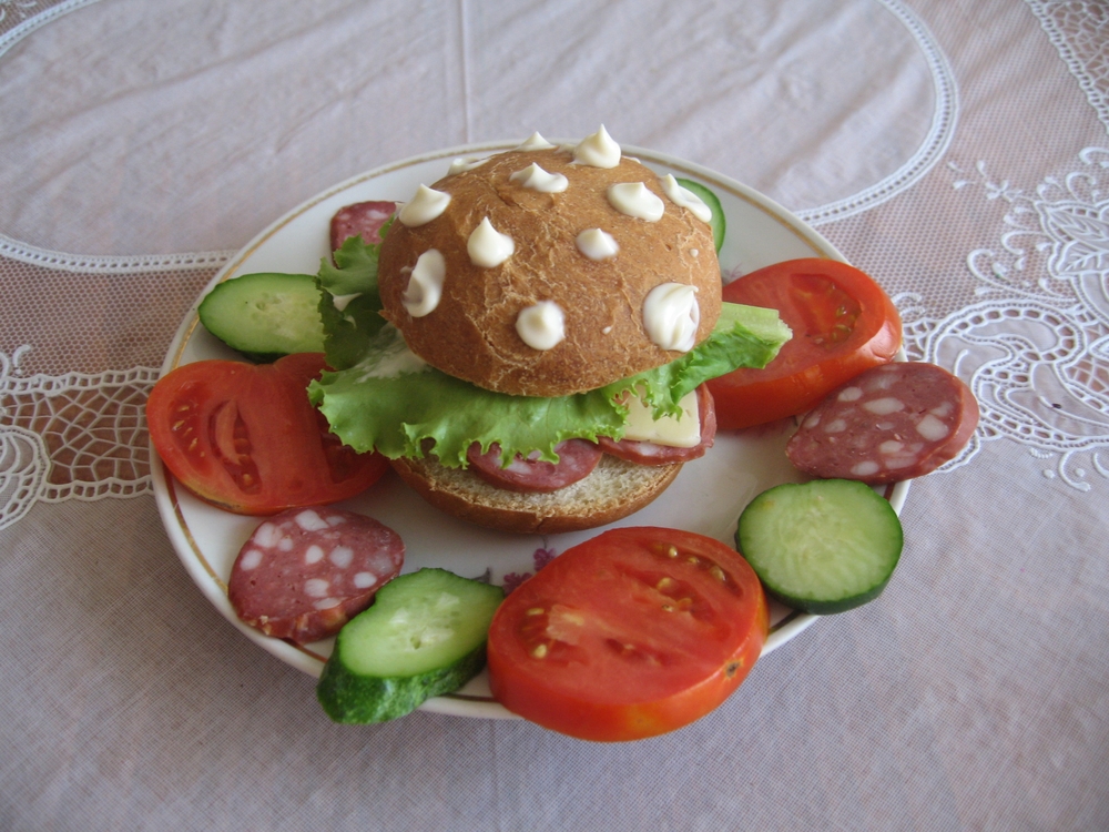 Разрезать булочку по полам, в середину положить колбасу, сыр, помидор, огурец, зелёный салат и залить майонезом. Украсить капельками майонеза. Угощайтесь на здоровье!!!