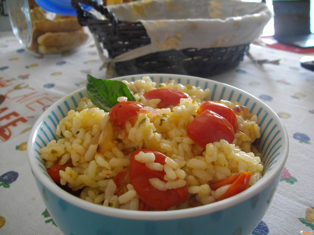 На 2 персоны понадобится: полстакана риса (промыть хорошо), 10-15 мелких помидорок «Черри» ( а лучше «Даттерини»), 2 чайных ложки сушеного орегано (душица), 1 золотистая луковица, соль, оливковое масло.