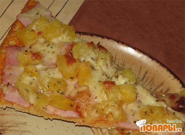 Практически готовую основу вынимаем из духовки, смазываем соусом, посыпаем немного сыром(я брала ламбер), выкладываем ветчину и ананасы, густо посыпаем сыром, сверху совсем чуть-чуть посыпаем орегано. Ставим в духовку минут на 7-10. Приятного аппетита!!!