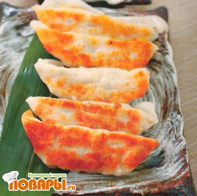 На хорошо разогретую сковороду влить растительное масло, выложить гёдза, быстро обжарить с обеих сторон до светло-золотистой корочки. Затем влить на дно немного горячей воды, закрыть крышкой и тушить, пока не выпарится жидкость {около 5 минут). После этого долить немного масла, дать гёдза зажариться и подавать.