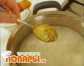 Доведите до кипения и проконтролируйте температуру: она должна составлять 115°С. Если у вас нет термометра, возьмите каплю сиропа, слегка остудите, а затем покрутите между пальцами - должен образоваться маленький шарик.