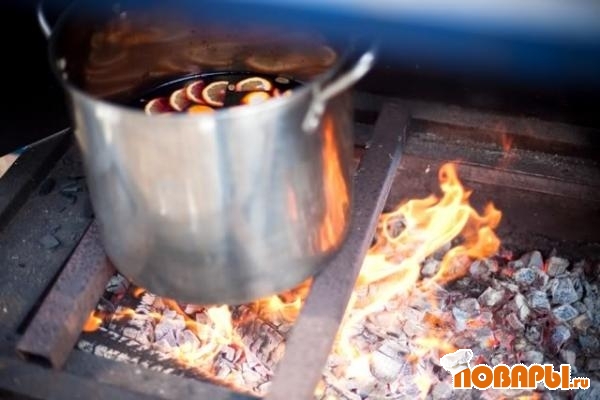 После добавления всех компонентов вино, постоянно помешивая, нагpевают на медленном огне пpимеpно до (60-65) (до появления пеpвых пузыpьков). Если вино нагpевать сильнее, до более высокой темпеpатуpы, то начнется интенсивное испаpение спиpта и появление от испаpения спиpта в вине pазличных вpедных для здоpовья пpимесей. Поэтому, нагpевать вино свыше (60-65) не следует!