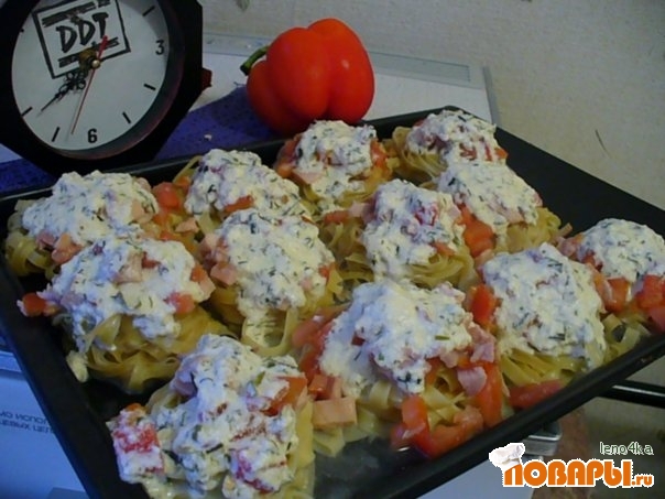 Отвариваем гнезда, выкладываем на противень (его ничем смазывать не надо), на каждое гнездо сверху кладем начинку: копченую курицу и помидоры порезать кубиками, добавить тертый чеснок перемешать и поливаем соусом каждое гнездо.