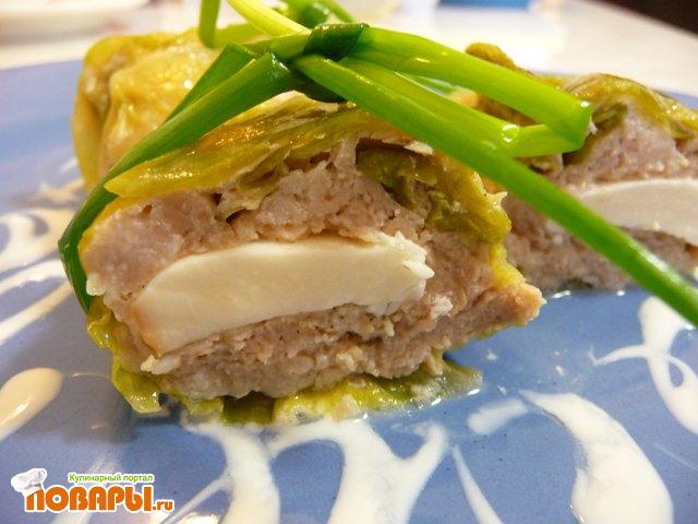На каждый капустный лист положить ломтик плавленного сыр и начинку. Листья свернуть.