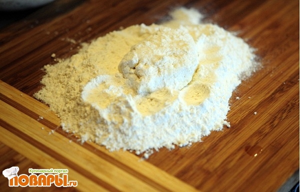 Кладем кучкой небольшое количества нашего теста и аккуратно обволакиваем его со всех сторон в муке.