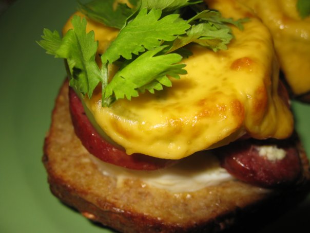 У булочек вынуть мякоть, смазать соусом из майонеза и кетчупа, положить по половинке яйца, сверху кружочки колбаски, кружочек помидора, колечко перца, внутрь колечка положить зеленый лук, сверху пластинку сыра и в духовку, до того момента, как расплавится сыр.