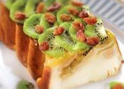Сверху выложить творожно-белковую массу. Поставить в духовку и выпекать 1 час. Оставшиеся кружки киви уложить сверху "чешуйками". Присыпать изюмом.