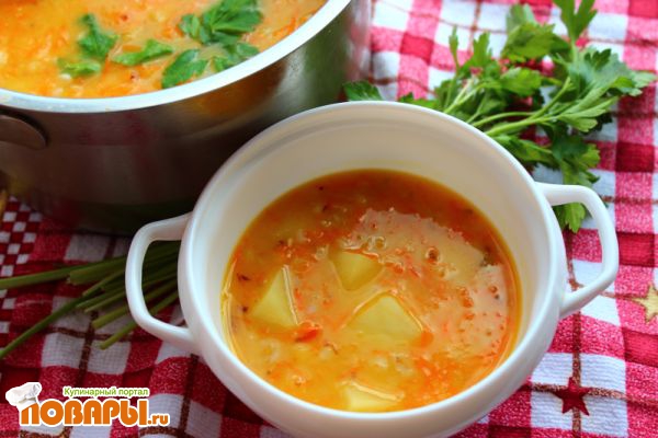 Заливаем морковь водой, солим воду, добавляем столовую ложку (или 2) гречки. Доводим до кипения и опускаем в бульон картофель, тыкву, перец (нарезаем произвольно, можно кубиками). Когда картофель будет практически готов, то добавляем в суп гороховое пюре, перловку. Варим еще несколько минут. Суп должен быть густым.