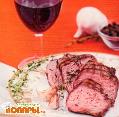 Выложить мясо на решётку, дать соку стечь и немного остудить. Нарезать острым ножом поперёк волокон ломтиками. Посыпать солью, чёрным перцем крупного помола и подавать к столу.