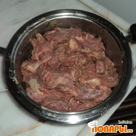 Говядину режем на кусочки, смешиваем с горчицей и ставим мариноваться в холодильник на 1 час.
