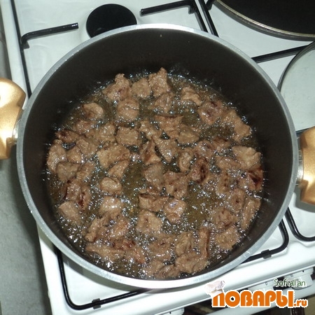 В разогретую кастрюлю наливаем масло, ждем, пока оно хорошо разогреется. Кладем в масло мясо, обжариваем 10-15 минут.