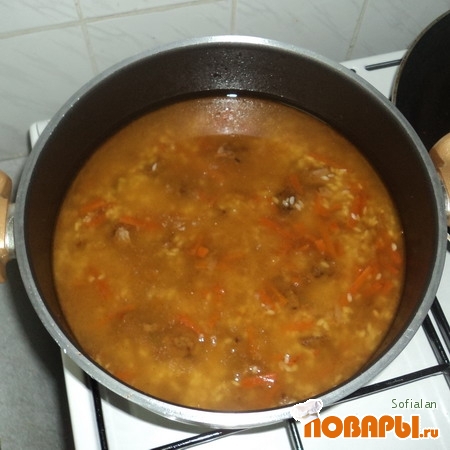 Всыпаем рис, перемешиваем. Если воды осталось мало, то необходимо добавить. Вода должна покрывать смесь на 1 см.