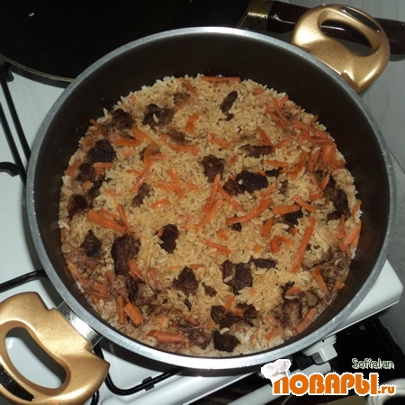 Накрываем крышкой, ставим на медленный огонь и тушим, пока рис не впитает всю воду, примерно 15-20 минут.