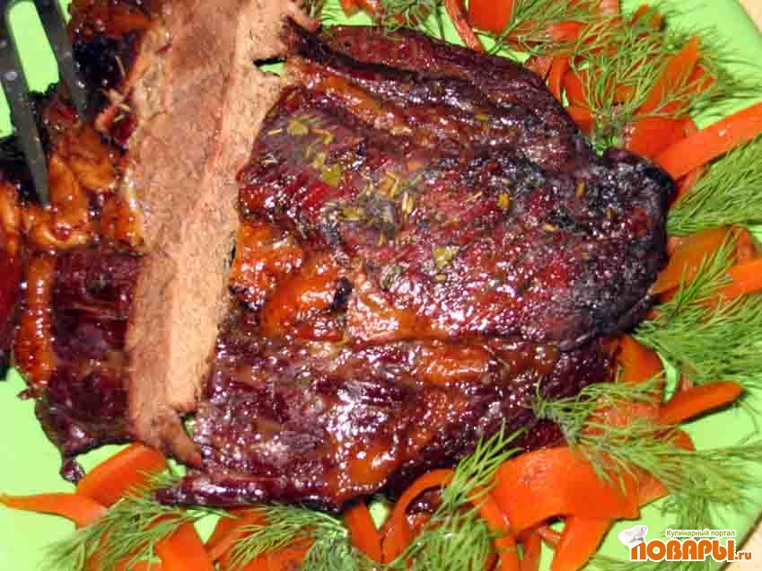 Тушить мясо в разогретой до 200С духовке 2 часа (можно больше, если вы любите сильно поджаренное мясо), периодически поливая сверху маринадом из сковородки