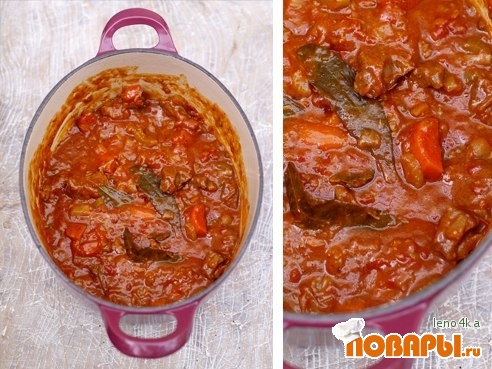 Добавляем помидоры, кетчуп (я брала хайнц), лавровый лист, перец, соль и доводим до кипения, под закрытой крышкой еще томим на медленном огне полчаса. Готовый соус протираем через сито.