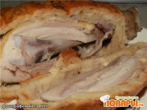 Положить пластинку сыра между кожей и мясом голени (в карман).