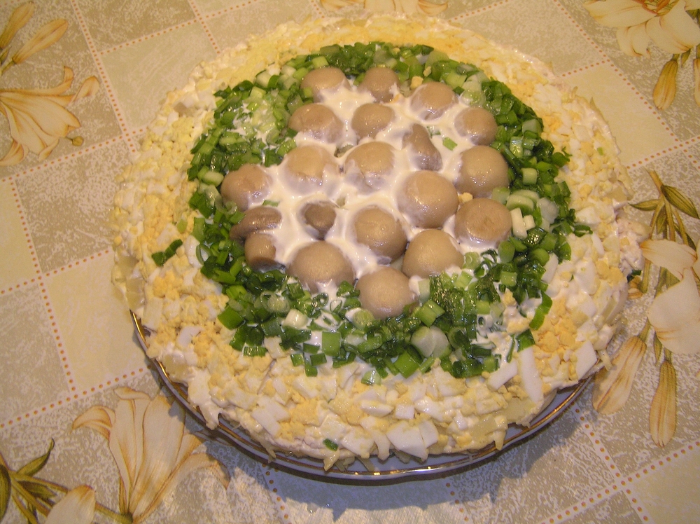 И вокгуг лука мелко порезаный желток. (это всё должно выйти как один слой)