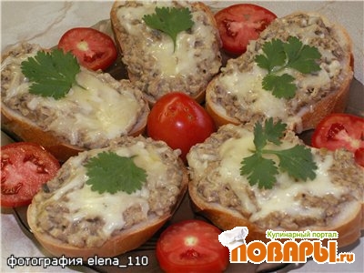 Запекать в духовке(при температуре 200 градусов) или в микроволновке на максимуме 1, 5 -2 минуты до расплавления сыра.