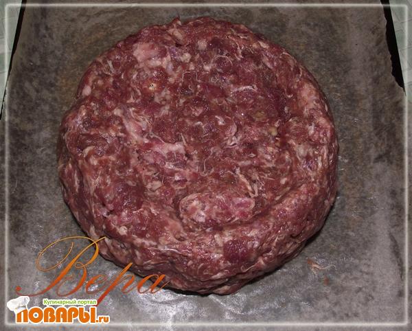 Фарш разделить пополам, 1 часть фарша выложить на смазанный противень.