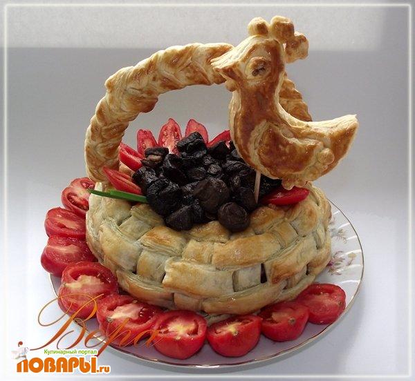 Тесто нарезать полосками шириной 1,5 см. сплести на основании из фарша лукошко.