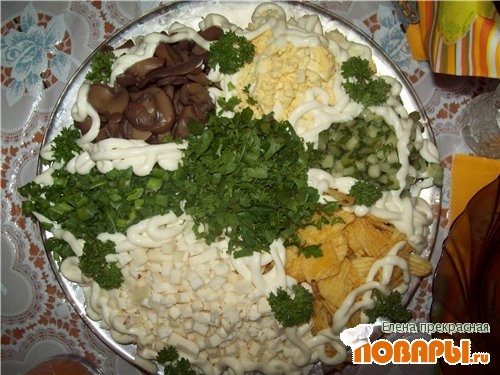 Блюдо намазываем густо майонезом,сверху майонеза выкладываем грками все продукты(по отдельности.) На столе уже смешиваем!