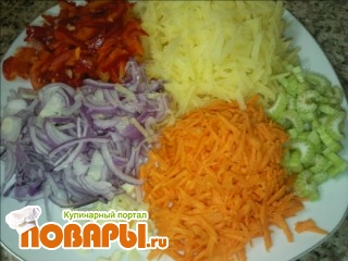 Варим мясо до готовности. Тем временем подготавливаем овощи, очищаем и трём на тёрке тонкой соломкой морковь, картофель, перец, лук и сельдерей.