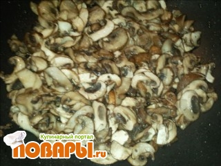 Отдельно трём грибы и на раскалёной сковороде с подсолнечным маслом обжариваем до золотистого цвета.
