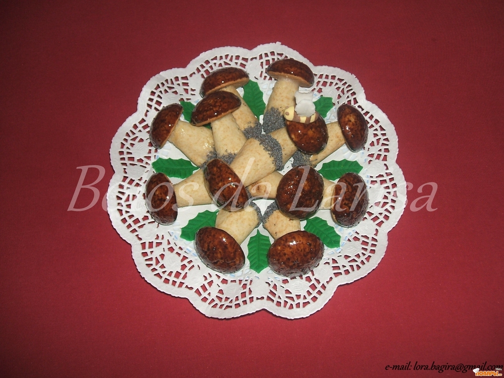 Смешать все ингредиенты и замесить эластичное тесто. Разделить на 80 частей. 40 скатать шариками (это шляпки) и выпечь на кальке. Другие 40, скатать в виде ножек, выпечь. Я пеку в корнетиках из пекарской бумаги, так они не деформируются и получаются ровненькие.