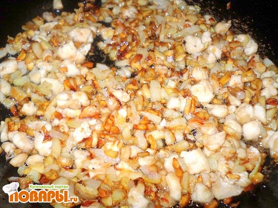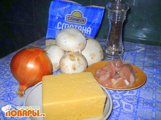 Отделяем от грибов ножки и нарезаем их мелким кубиком, таким же кубиком нарезаем репчатый лук и куриное филе. Разогреваем сковородку с растительным маслом, сначала подрумяниваем курочку, затем лук с грибами, доводим до золотистого цвета, не забываем посолить и поперчить, далее смешиваем поджарочку со сметаной.