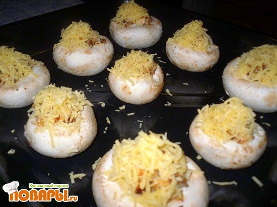 На мелкую терку натираем сыр. Выкладываем на противень шляпки грибов и заполняем их с горкой уже подготовленной начинкой, сверху посыпаем натертым сыром и отправляем в разогретую духовку до 180С на 10 минут.